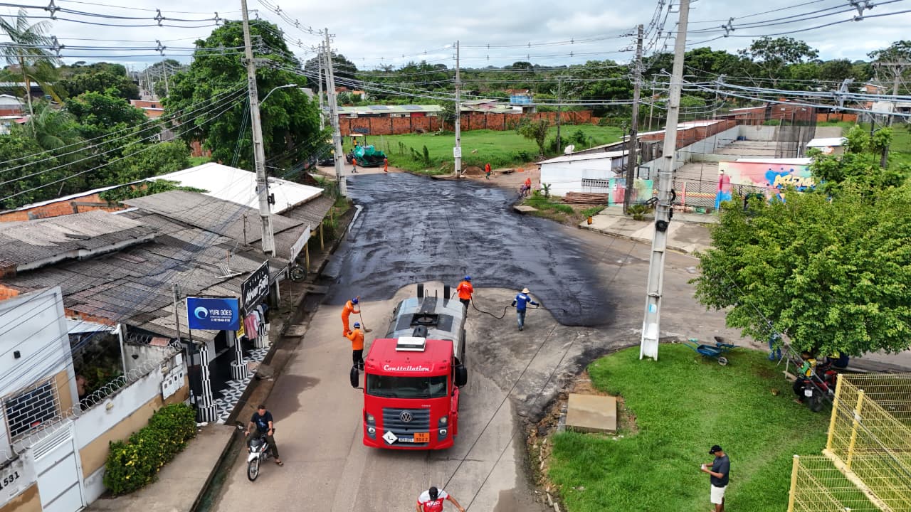 Após drenagem e terraplanagem, inicia asfaltamento na Estrada Eduardo Braga com Massaranduba