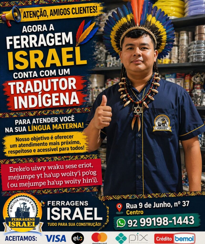 “Decidimos contratar o tradutor indígena para oferecer um atendimento mais próximo, respeitosa e acessível, na língua materna dos nossos irmãos indígenas. Ereke’o uiwy waku sese eriot, mejumpe ha’up woity hin’i”, publicou Israel Neto, proprietário da Israel Barreirinha.