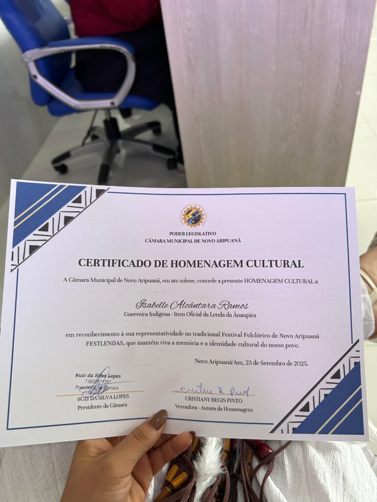 “Aqui em Novo Aripuanã nos estamos vivendo um festival. É o Festlenda que é a disputa entre 4 lendas. E o Festival ele não é so cultura, é também economia. Então, precisamos que ele chegue mias longe. E nós importamos e exportamos cultura e a Alcântara ela é uma cultura que vem de um festival maior que o nosso e ela trás pra nós um brilhantismo. Ela é uma guerreira indigena da Lenda Anaupira e ela também leva nossa cultura pra outro lugar e é essa a importância desse mérito, disse a vereadora.