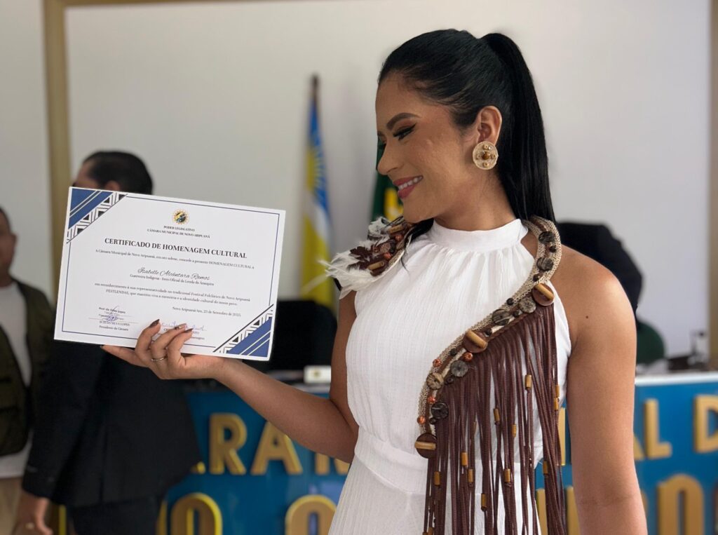 A estudante de Enfermagem e artista Isabelle Alcântara foi agraciada com o Mérito Cultural da Câmara Municipal de Novo Aripuanã na manhã desta terça-feira (23). A propositura da homenagem partiu da vereadora Cris Regis, e a cerimônia, realizada no plenário da Casa, contou com a presença de um público numeroso.