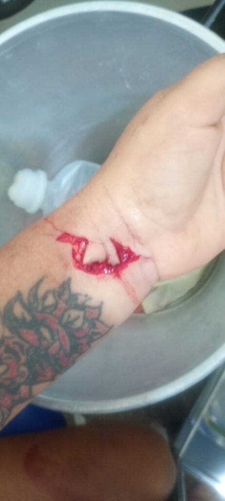 A vítima sofreu uma lesão profunda no pulso esquerdo, além de ferimento no ombro, sendo imediatamente orientada a buscar atendimento médico.