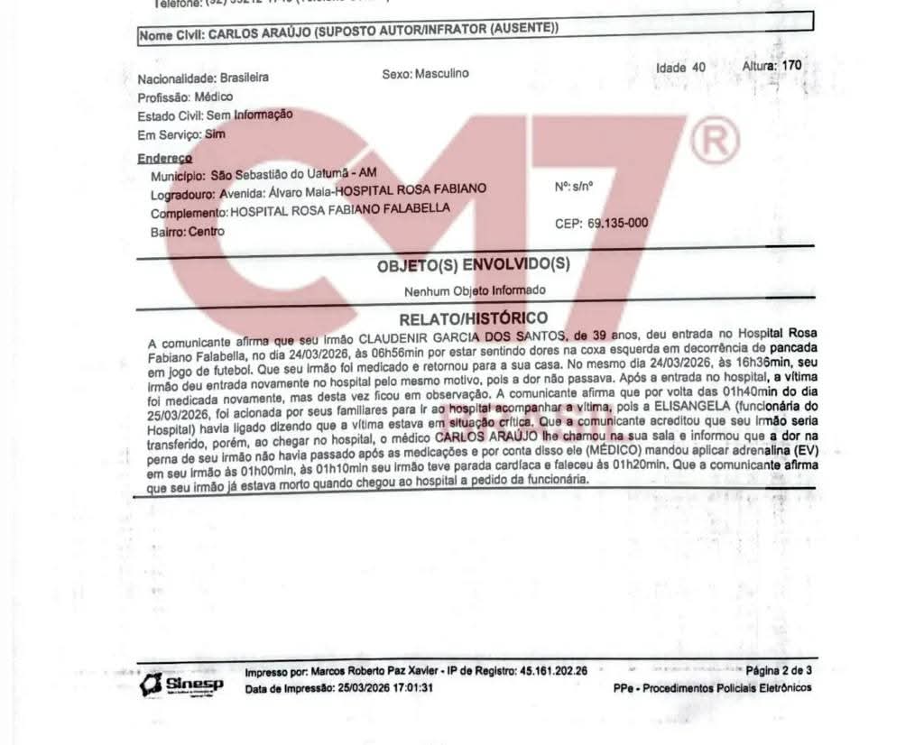 O trágico episódio foi registrado na Polícia Civil sob a natureza de homicídio culposo. De acordo com o Boletim de Ocorrência registrado pela irmã da vítima, Eliane Garcia dos Santos , Claudenir procurou a unidade de saúde na manhã do dia 24 de março de 2026, às 06h56, queixando-se de dores na coxa esquerda após sofrer uma pancada durante um jogo de futebol.