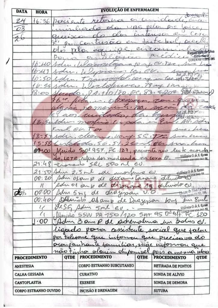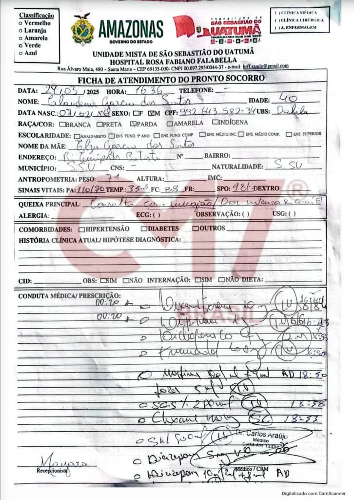 Ele foi medicado e liberado para voltar para casa. Como a dor não cessou, o paciente retornou ao hospital na tarde do mesmo dia, dando entrada às 16h36. A ficha de evolução de enfermagem detalha que, durante o período em que esteve em observação, Claudenir recebeu diversas medicações fortes para o controle da dor contínua, incluindo Tramadol, Dipirona, Diazepam e Morfina.